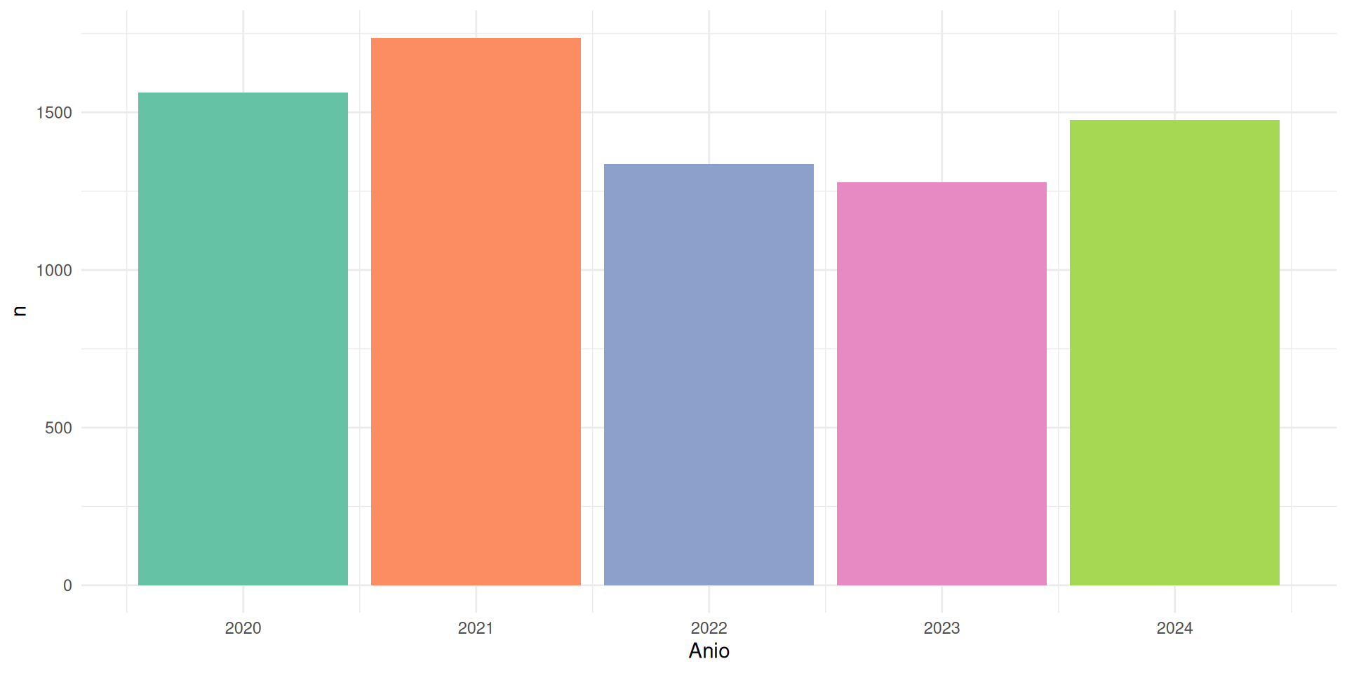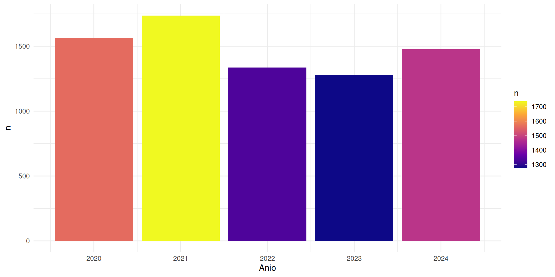 aes(x = Anio, y = n, fill = factor(Anio))) +