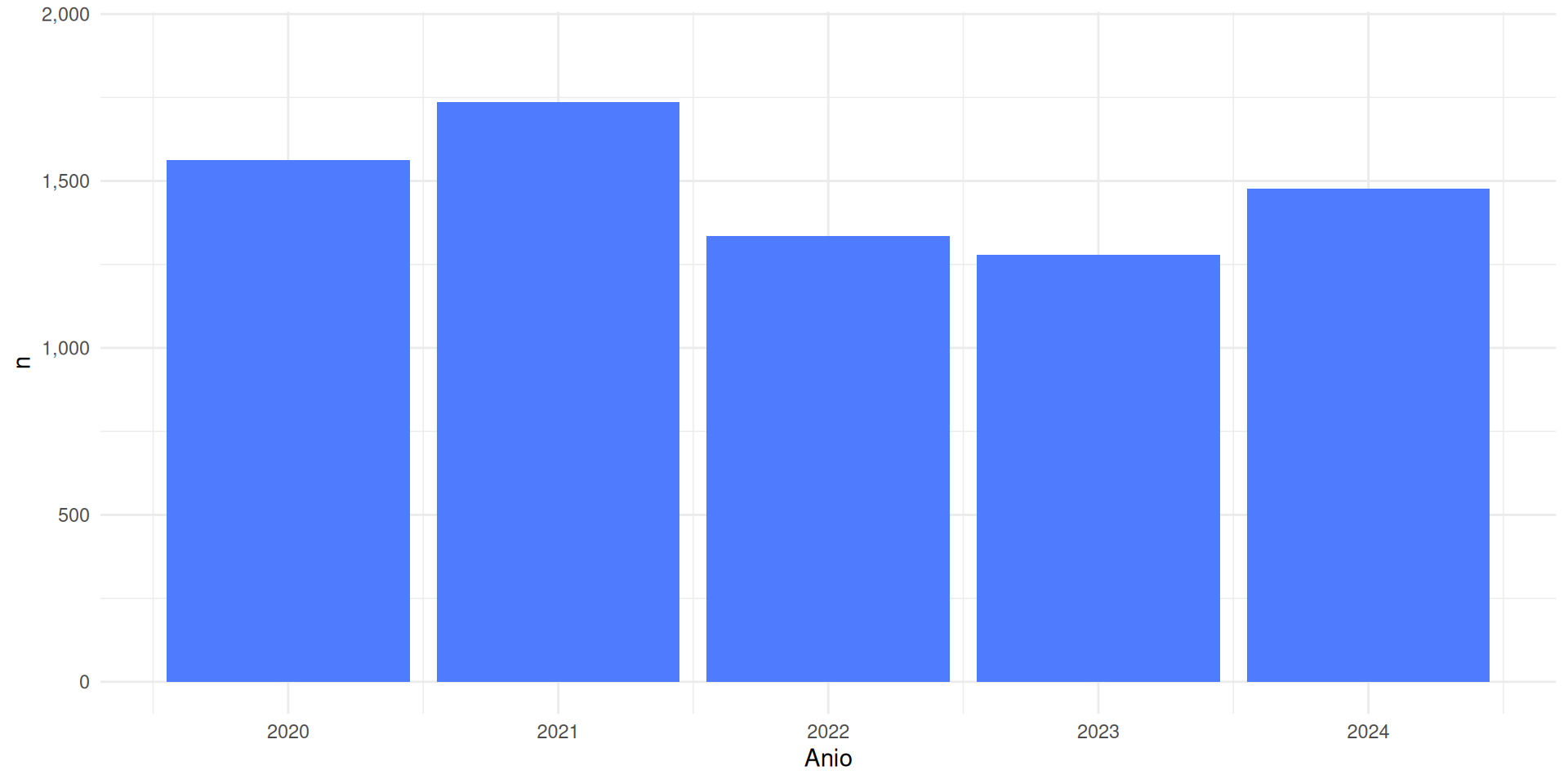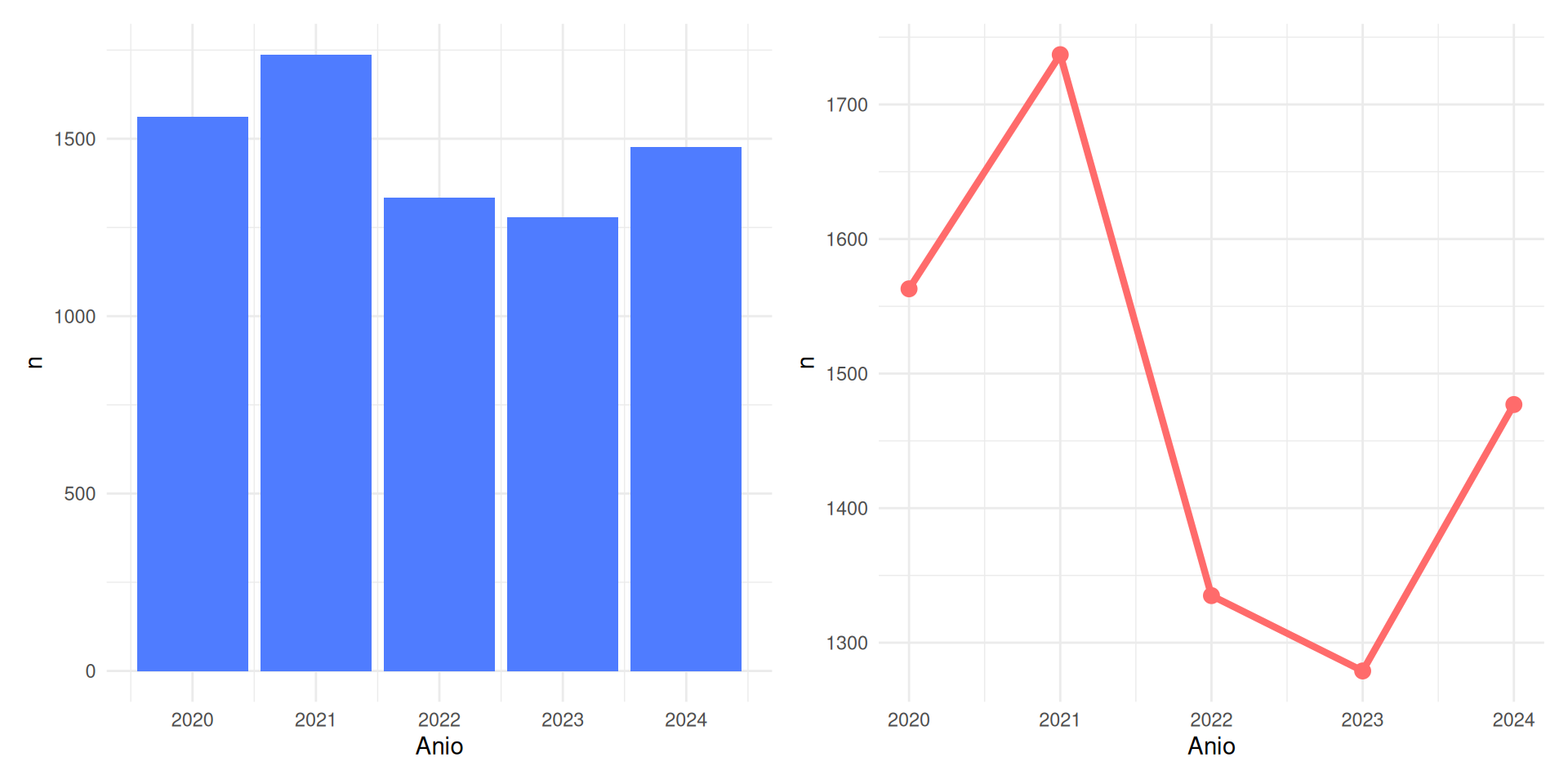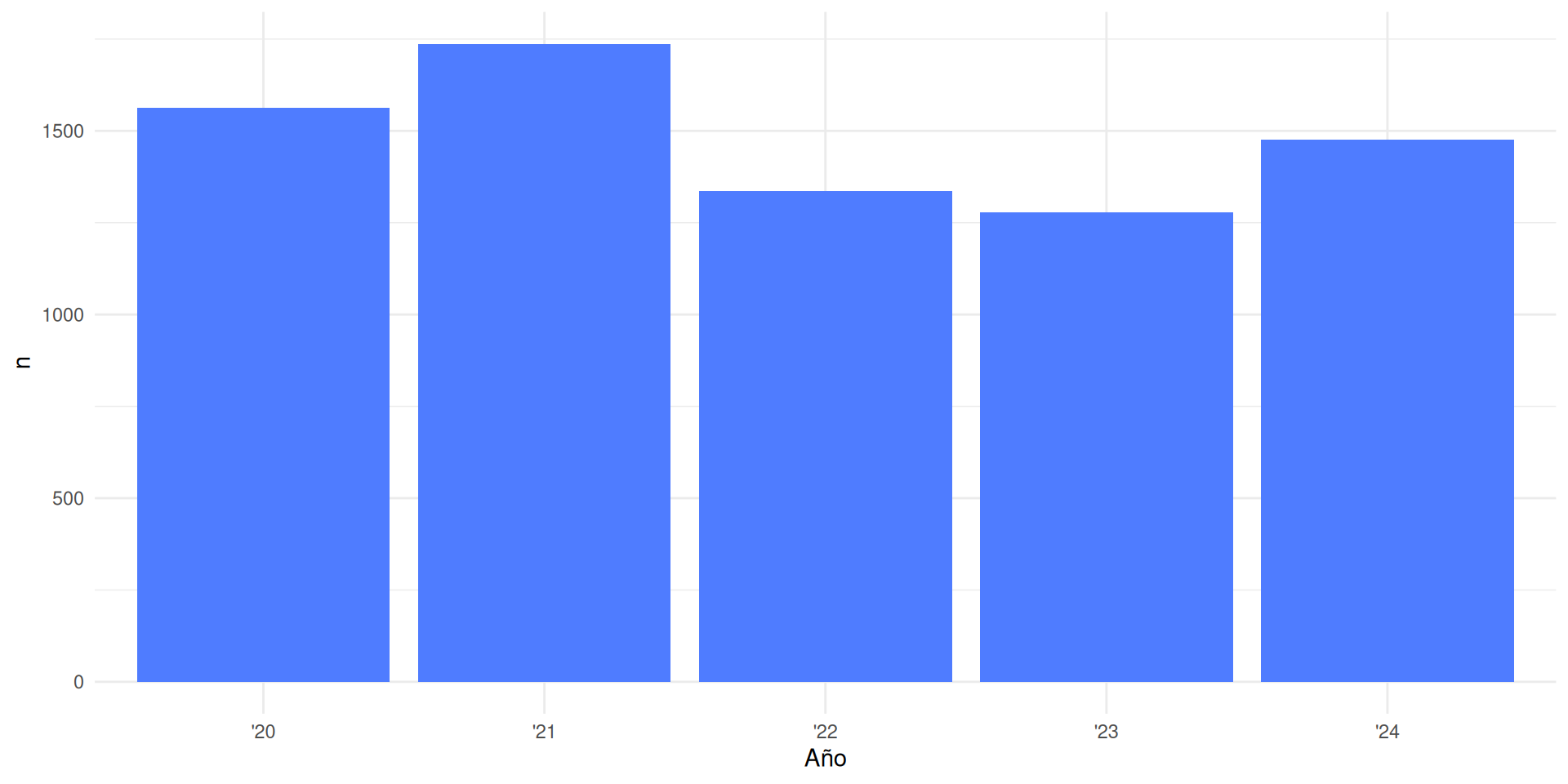 ggplot(tbl_desocup_2020_25, aes(x = Anio, y = n)) +